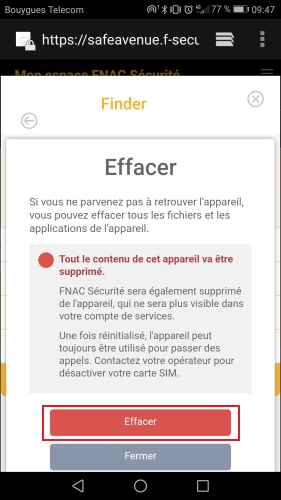 Cette option effacera tout le contenu de votre appareil ( Fichiers, applications, données...), votre appareil sera réinitialisé et configuré comme en sortie d'usine. Fnac sécurité ne sera plus installé sur cet appareil, votre appareil pourra donc être utilisé pour passer des appels. Contactez votre opérateur pour désactiver la SIM.